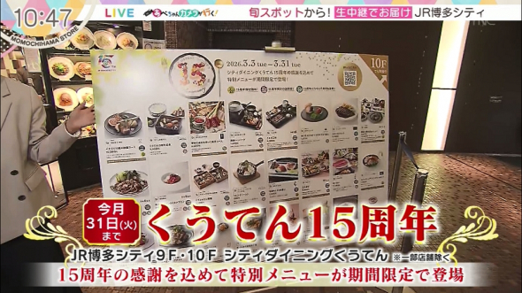 ★田中健二が福岡県の揚げたてグルメを食べ尽くすガチンコ企画「AGETATE」今回は新宮町で揚げたて調査!福工大駅前にある人気居酒屋で福岡ではあまり見かけない北海道では居酒屋メニューや家庭料理として親しまれている揚げ物を発見。そして、大型家具店の近くではアジフライ専門のキッチンカーを発見。さらに、中継コーナーで活躍中のあべちゃんからおすすめの揚げたて情報もゲット。今回はどんな揚げたてに出会えるのか?★2代目うどんの人“朝光”が福岡のうどんを食べ尽くす「うどんMAP」。今回はから福岡市西区からスタート!人が多いはずの福岡市内で朝光くんまさかの大苦戦!?そんななかようやく出会えたのはホロホロお肉がたまらない“牛すじうどん”!さらに、2 軒目を求めて海を渡る!?あまりにもお得すぎるトッピングてんこ盛りの一杯も登場します!★福岡県内のオススメスポットへお邪魔して“旬のネタ”を魅力たっぷりに生中継でお伝えする「あべちゃんカメラが行く!」。今回はJR博多シティのレストラン「シティダイニングくうてん」からお届け!この春、15周年を迎えるくうてんでは感謝の気持ちを込めた記念のメニューが期間限定で登場します。この時期だけ味わえる豪華メニューをご紹介します。