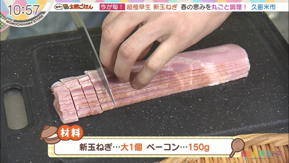 ②新玉ねぎは上下を切り落とし、玉ねぎの半分くらいまでかくし包丁をいれておく。ベーコンは小さめにカットしておく。