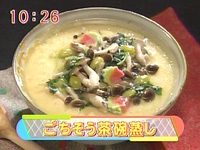 たまご 4個水 3カップ白だし 小6鶏もも肉 1/2枚ぎんなん 8個三つ葉 1/2わもみじ生麩 1/2本しめじ 1/2パック餅 4個a)水 1カップ 白だし 小2片栗粉、水 各小1