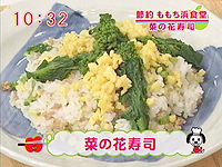 4人分菜の花 1わだし 1カップ a)薄口しょうゆ 大1 みりん 大1 鶏ひき肉 100gしょうゆ 大1みりん 大2だし 1/3カップ 卵 2個b)砂糖・酒 各大1 塩 ひとつまみ 米 2カップ寿司酢)酢 大3 砂糖 大2 塩 小1