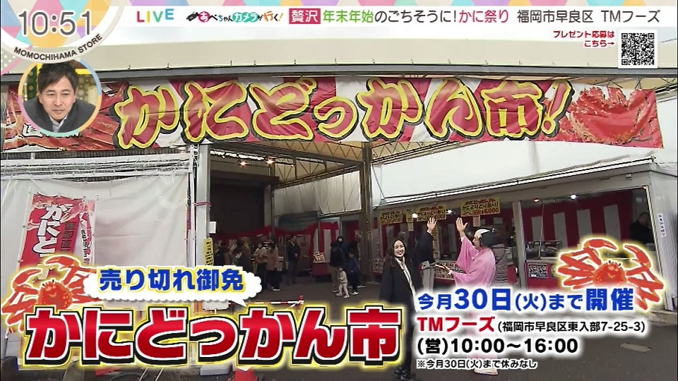 【住所】福岡市早良区東入部7-25-3 【営業時間】10:00~16:00 売り切れ御免 かにどっかん市 12/30まで開催 *中継にて紹介