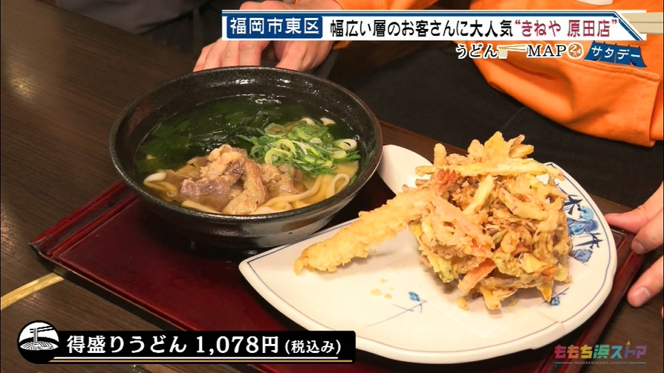 【住所】福岡市東区原田1-24-37 【電話】092-622-1098 【営業時間】11:00~21:30 得盛りうどん 1078円(税込み) *うどんMAPサタデーにて紹介