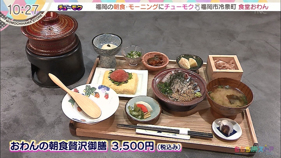 【住所】福岡市博多区冷泉町9-20 おわんの朝食贅沢御膳 3500円(税込み) *木曜日のチューモクにて紹介