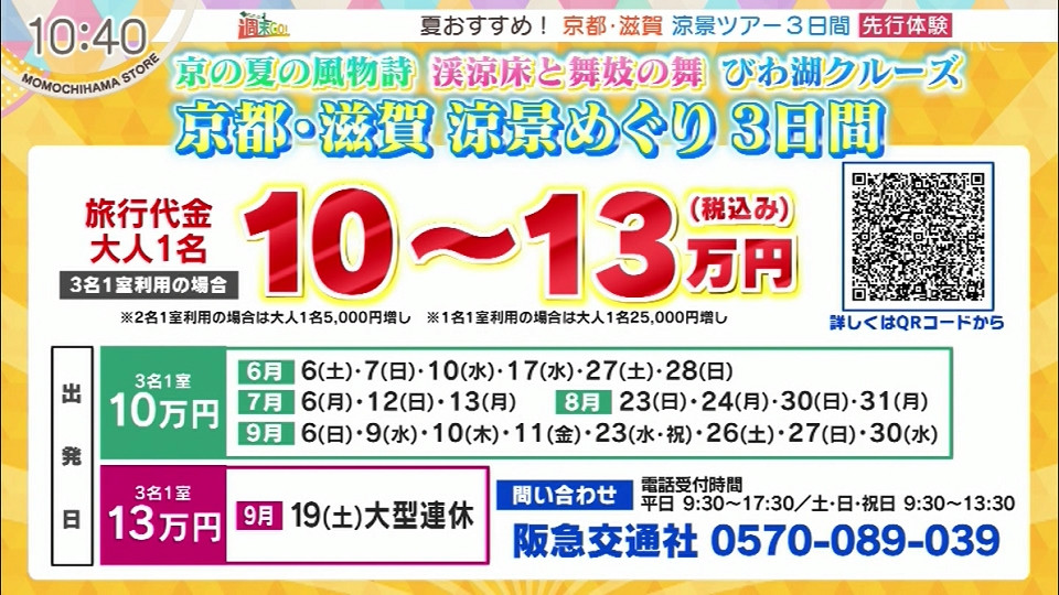 【電話】0570-089-039(電話受付時間 平日9:30~17:30 / 土日祝9:30~13:30) 京都・滋賀 涼景めぐり3日間 旅行代金 大人1名(3名1室利用の場合)10~13万円(税込み) *週末GOにて紹介