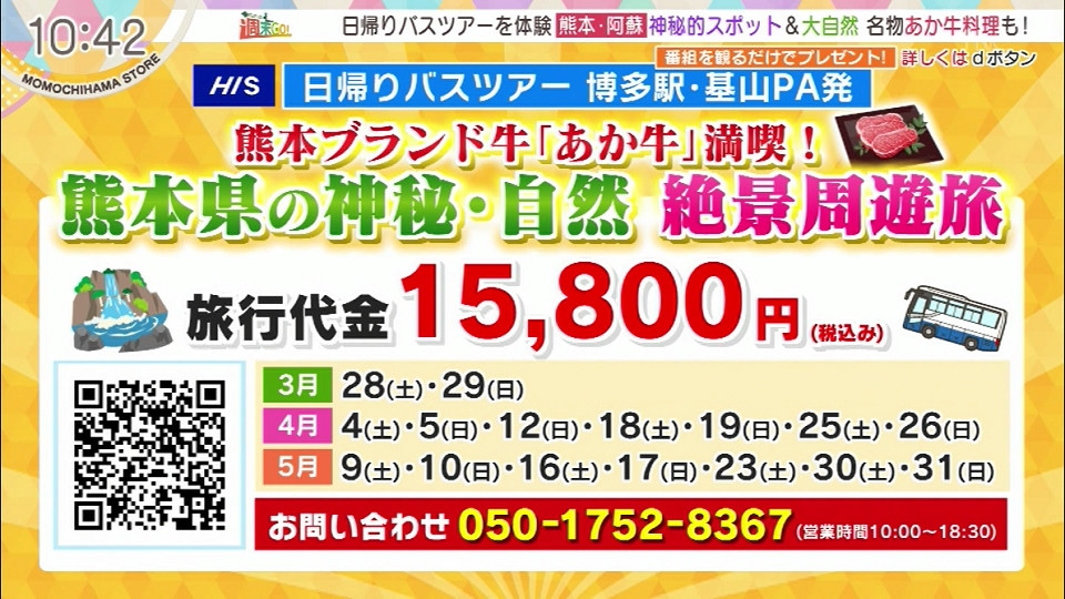 【電話】050-1752-8367 (営業時間 10:00~18:30) 熊本県阿蘇日帰りバスツアー 旅行代金 15800円(税込み) *週末GOにて紹介