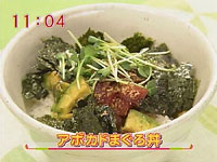 アボカド 1個刺身用まぐろ 200gしょうゆ 大3ごま油 大1わさび 小2焼き海苔 1枚貝割れ菜 適量ごま 適量