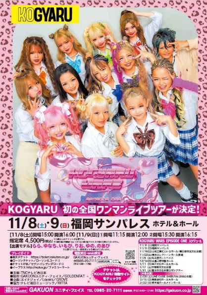 | 日 時 | 2025年11月8日(土) ①開場15:00 開演16:00 2025年11月9日(日) ①開場11:15 開演12:00 ※公演が一部変更になりました。 詳しくはKOGYARUオフィシャル全国ツアーサイトまで https://kogyaru.jp/ |