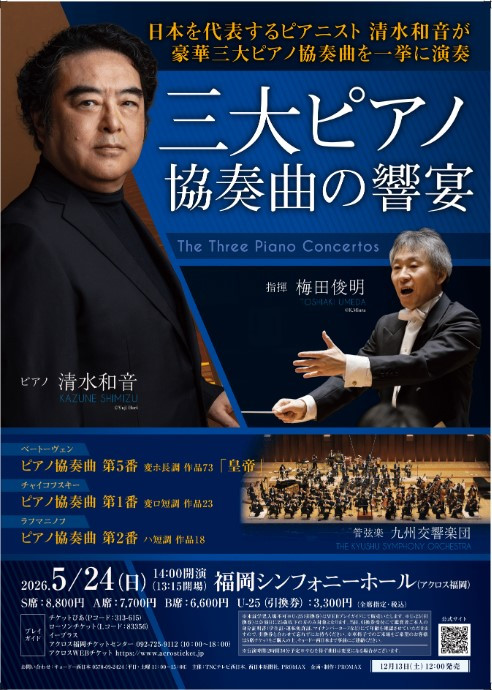 | 出 演 | ピアノ 清水和音 指揮 梅田俊明 管弦楽 九州交響楽団 |