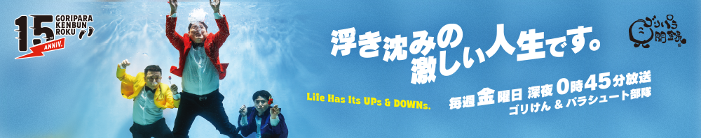 ![[ゴリパラ見聞録] ゴリけんとパラシュート部隊が人間性まるだしで旅をするドキュメンタリーバラエティー番組。テレビの前のあなたのために、日本全国どこへでも代わり行き、お望みの写真を必ず撮ってきてメールします。](/goripara/img/common/cor_main.png?2025)