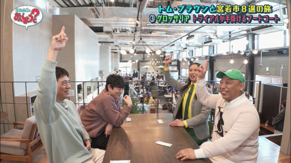 トム・ブラウンと地元民おすすめ宮若市8選の旅前編。まずは福岡の人気観光地のひとつ脇田温泉へ。倉庫を改装したおしゃれなカフェを訪れる。そこで教えてもらったのはとある個室。入ってみると4人も驚きの空間が。続いては小学校の体育館跡に作られたフードホールへ。宮若産の食材を使った料理の数々に大食いのトム・ブラウンが本領を発揮する。そして見どころは日本一に輝いたパン。意外なご当地食材を使ったパンに4人も驚き。