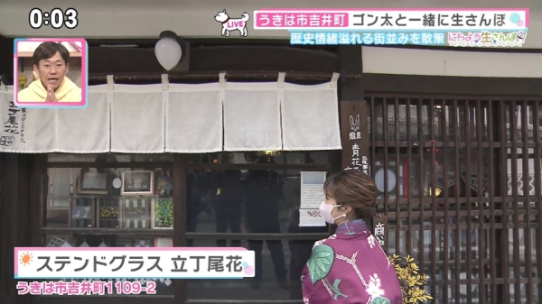 あべてつあきと五十嵐アナがゴン太と一緒に日曜のお昼にピッタリなおでかけスポットを生さんぽ!今回はうきは市吉井町の白壁通りをアンティーク着物を身につけて散策します。
