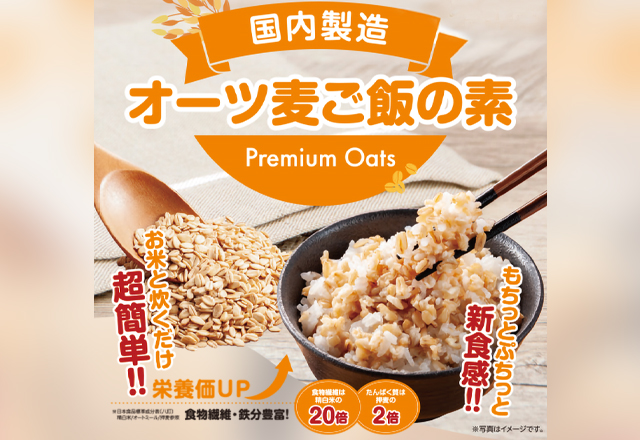 お米と一緒に炊くだけで美味しいオーツ麦ご飯の素ができました。程よい厚さに加工することにより「もちっとぷちっと食感」が楽しめます。不足しがちな栄養素、食物繊維、カルシウム・鉄分などを補うことが可能です。 |