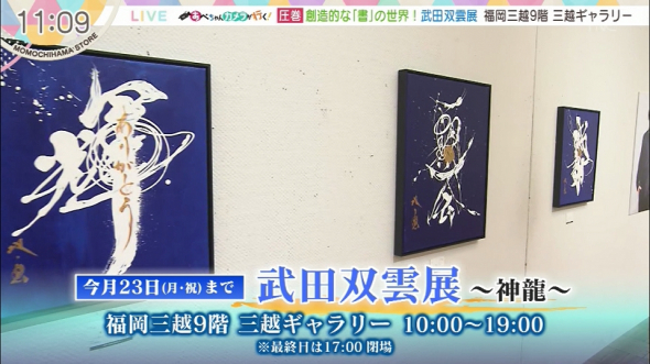 ★「あべちゃんカメラが行く!」。今回は福岡三越で開催中の書道家・武田双雲展の会場からお届け!7 つのテーマ別に作品を展示。さらにご本人が生出演!