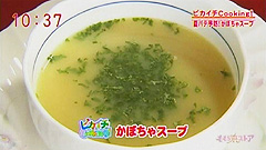 (2)ミキサーにかけたかぼちゃを鍋に戻し、スープにまぜながら加熱する 沸騰したら牛乳、塩、薄口しょうゆ、うまみ調味料で味つけする 器に注ぎ、いろどりにパセリを飾ればできあがり