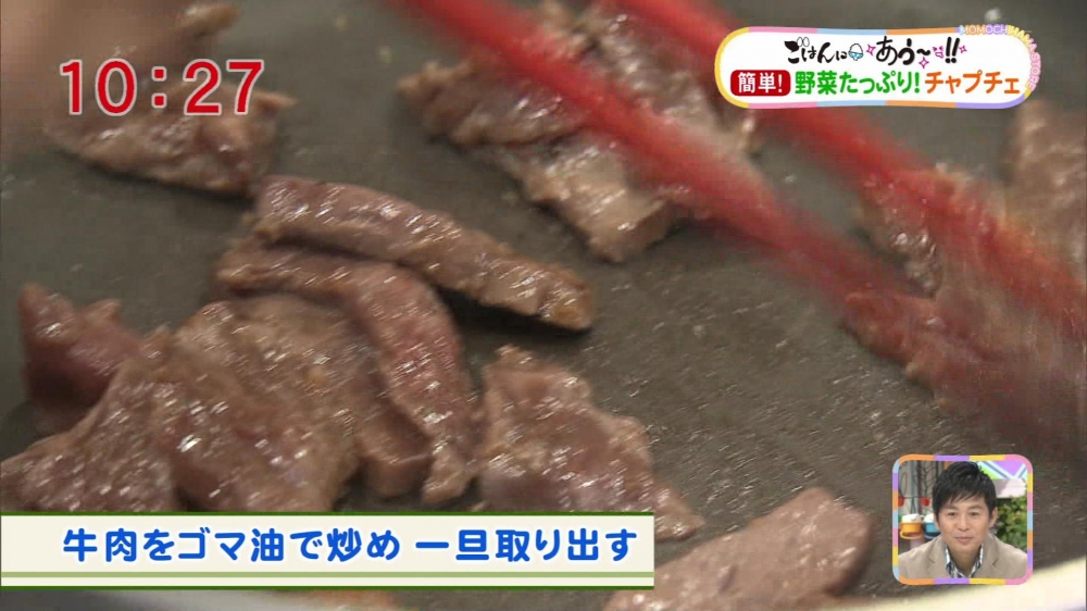 (3)フライパンにごま油を熱し、牛肉を炒めたら一度取り出す