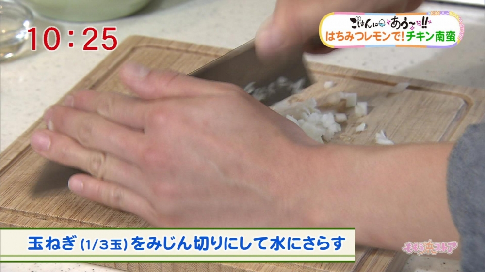 (1)ゆで卵はみじん切り、玉ねぎはみじん切りにして水にさらす
