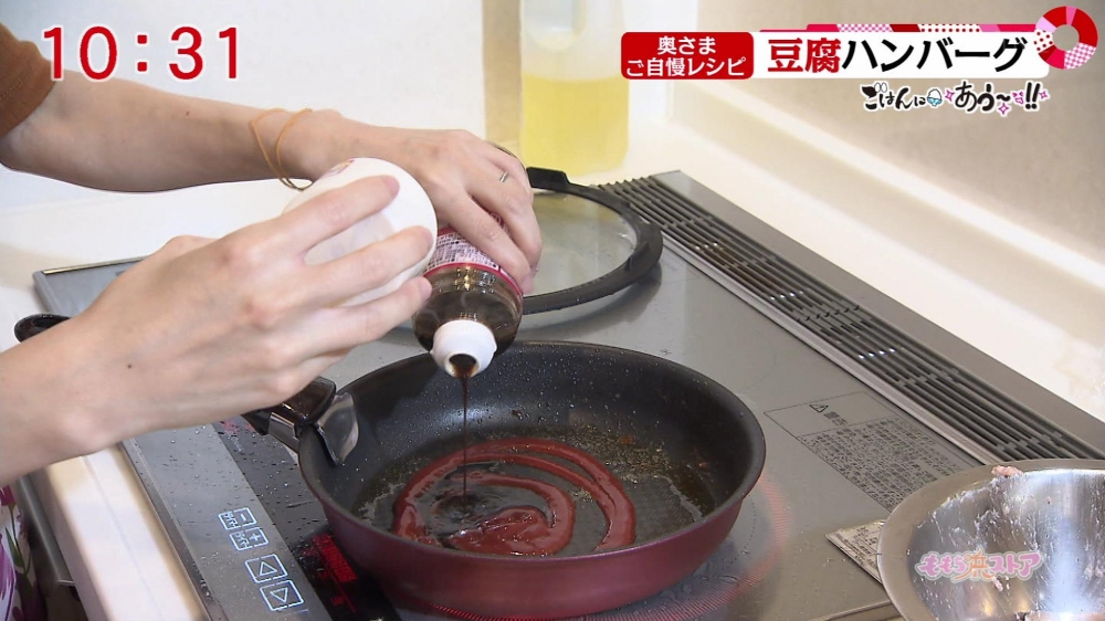 (5)ハンバーグを取り出し、フライパンに残った肉汁にケチャップ・ウスターソースを加えて火にかける