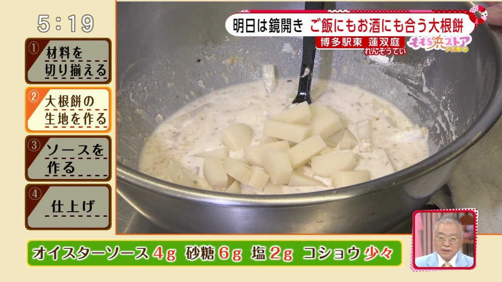 【材料】 2人分 鏡餅 100g 大根(皮をむいて) 100g ザーサイ(軽く塩分をぬく) 10g *高菜漬け等でも代用可 干しエビ(戻したもの) 10g 干し貝柱(戻したもの) 10g *ソーセージでも代用可 長ねぎ 6g XO醤 30g *醤油+マスタードまたはポン酢+柚子こしょうでも可 ネギ油 小2 上新粉 100g 浮き粉 30g サラダ油 小1 砂糖 6g 塩 2g こしょう 少々 オイスターソース 4g ごま油 小1 卵 1個