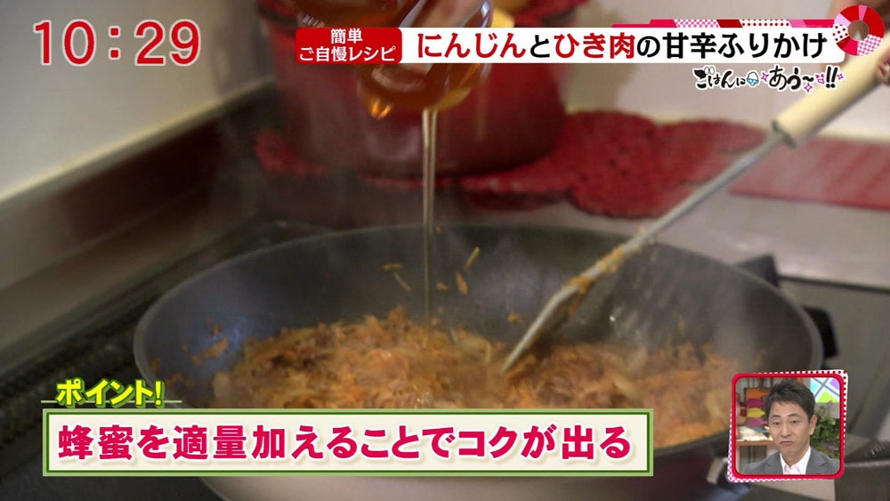 (4)にんじんがしんなりしたらフライパンの半分に寄せ、ひき肉を炒める