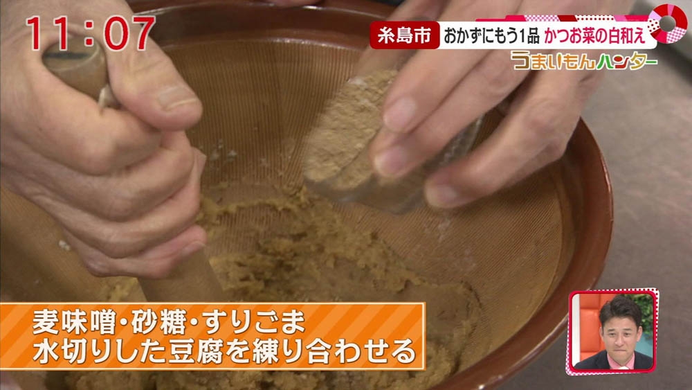 (6)すり鉢に麦味噌・砂糖・すりごま・水を切った豆腐を入れ、よく練り合わせる