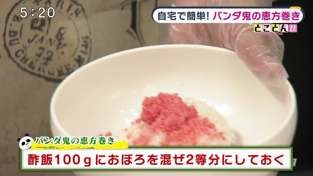 (7)酢飯100gをボウルに入れ、おぼろを混ぜて2等分にする