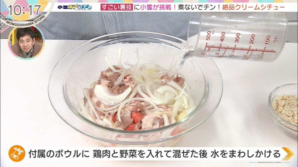付属のボウルに 鶏肉と野菜を入れて混ぜた後 水をまわしかける