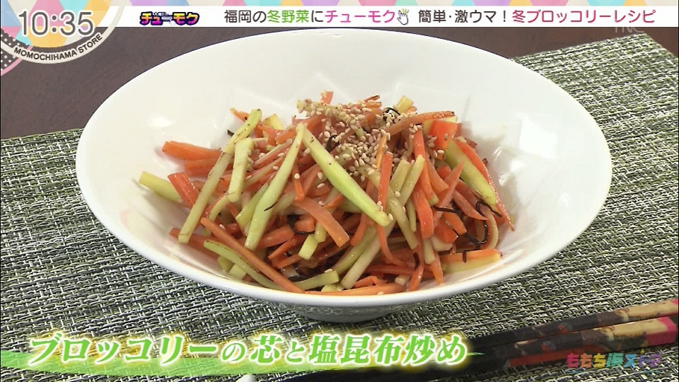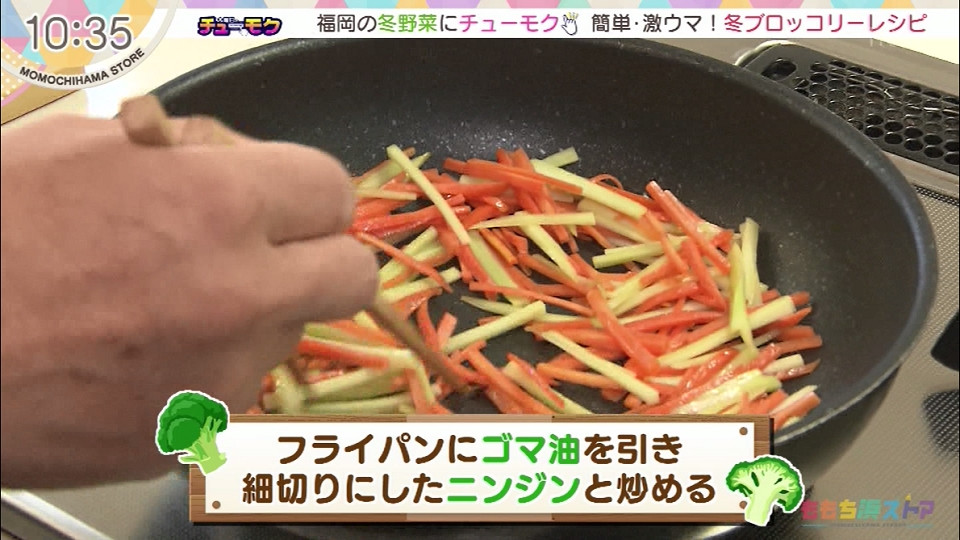 ①芯の皮を取り除き細切りにフライパンにゴマ油を引き細切りにしたニンジンと炒める。