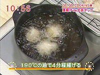 (2)の鶏肉に片栗粉をまぶしてよくもみ込み、190度に熱した揚げ油で4分ほど揚げる 中まで火が通り、カリっと揚がればOK