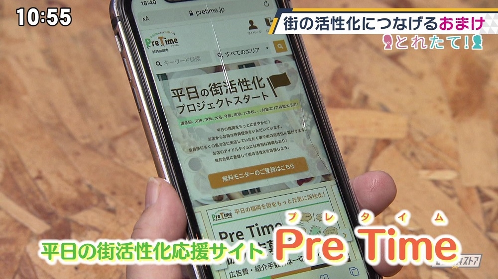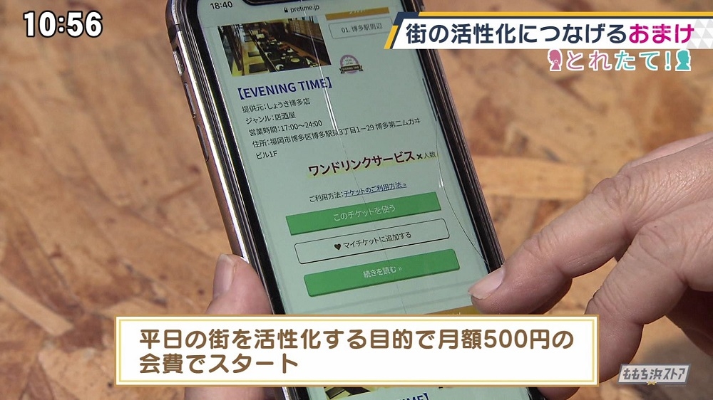 平日の街を活性化する目的で会費月額500円でスタートしたサイト 3/10~6/30まで無料モニター会員5000人募集中 現在福岡市内約130店舗で利用可能 *とれたて!にて紹介