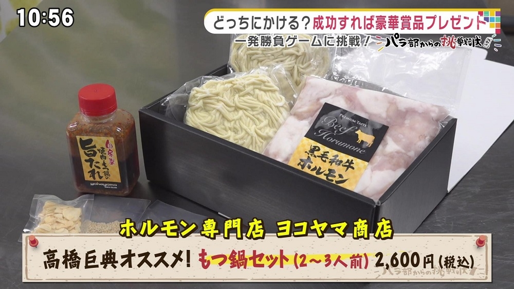 【住所】福岡市早良区高取1-2-16 【電話】092-834-8029 もつ鍋セット(2~3人前) 2600円(税込) *パラ部からの挑戦状にて紹介