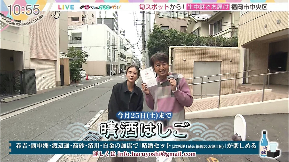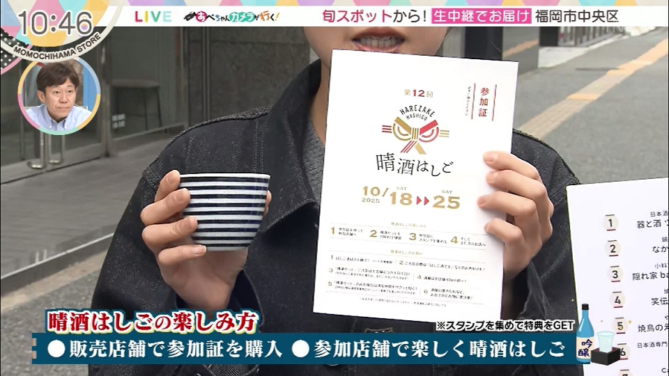10/25まで開催中 春吉・西中洲・渡辺通・高砂・清川・白金の加盟店で晴酒セットが楽しめます。 ◎博多海鮮 雅 福岡市中央区高砂1-2-10 1F 092-526-6448 (営)17:30~23:00os *日曜は22:00os (休)月曜 ◎竹餃大学 福岡市中央区高砂1-1-13 092-753-9877 (営)11:30~21:00os (休)日曜 *中継にて紹介