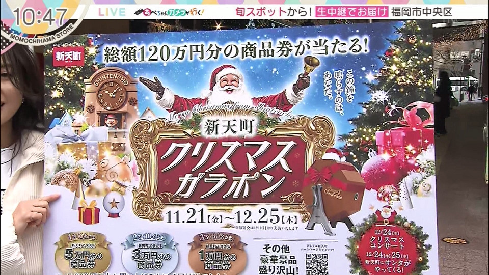 【住所】福岡市中央区天神2-9 新天町クリスマスガラポン 12/25まで開催中 *中継にて紹介