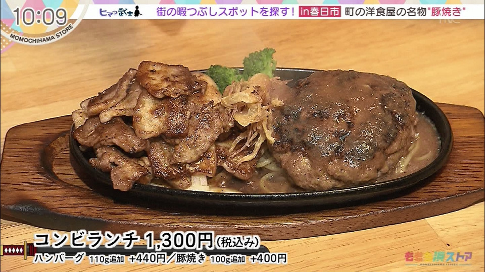 【住所】春日市上白水4-56 コンビランチ 1300円(税込み) ハンバーグ110g追加 +440円 / 豚焼き100g追加 +400円 *ヒマつ武士にて紹介