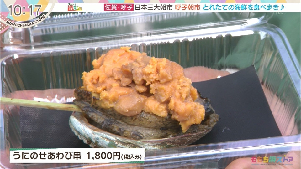 【住所】佐賀県唐津市呼子町呼子3764-30 うにのせあわび串 1800円(税込み) *週末GOにて紹介